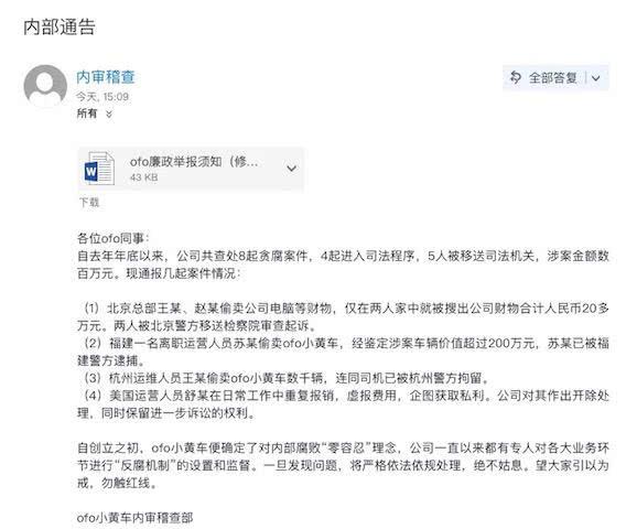 今天下午,ofo正式发布内部反腐邮件。
