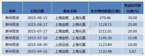 2015年12月9日,新华百货发布公告称,上海宝银及其一致行动人持有公司股份已至32%,成为公司第一大股东,且不排除未来12个月内继续以“要约收购”等方式继续增持新华百货的股份。